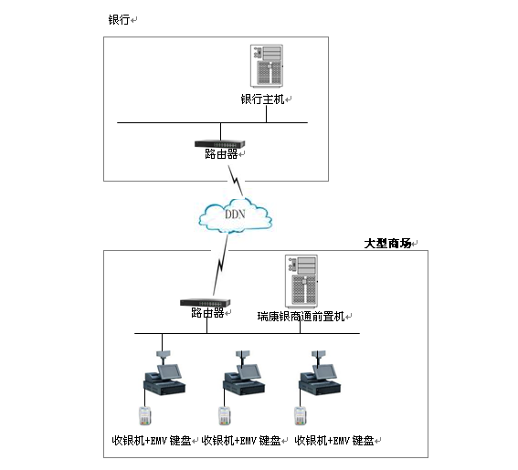 在本方案中通過在商戶收銀機上外接EMV密碼鍵盤或POS即可實現(xiàn)銀行卡受理,交易由商戶收銀系統(tǒng)發(fā)起,在EMV鍵盤或POS上完成銀行卡收單交易數(shù)據(jù)的采集,通過商戶內(nèi)部網(wǎng)絡(luò)經(jīng)由商戶與銀行的專線將銀行卡交易數(shù)據(jù)上送銀行處理,銀行處理完成后將交易數(shù)據(jù)返回到EMV鍵盤或POS終端,終端將把交易的結(jié)果反饋給商戶收銀系統(tǒng)完成交易。